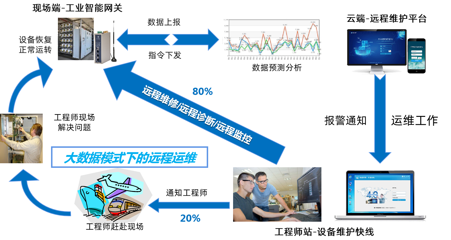 物通博聯(lián)設(shè)備遠(yuǎn)程維護(hù)系統(tǒng)由現(xiàn)場(chǎng)端的工業(yè)智能網(wǎng)關(guān)、工程師站的設(shè)備維護(hù)快線、云端的設(shè)備遠(yuǎn)程運(yùn)營(yíng)管理平臺(tái)三部分組成,構(gòu)建了一條通往遠(yuǎn)端工業(yè)現(xiàn)場(chǎng)的遠(yuǎn)程維護(hù)的安全數(shù)據(jù)通道,實(shí)現(xiàn)工程師對(duì)設(shè)備遠(yuǎn)程維護(hù)、診斷、調(diào)試和遠(yuǎn)程上下載程序,極大降低工程師出差成本,提高工程師的工作效率,實(shí)現(xiàn)了預(yù)防式遠(yuǎn)程維護(hù)及管理。