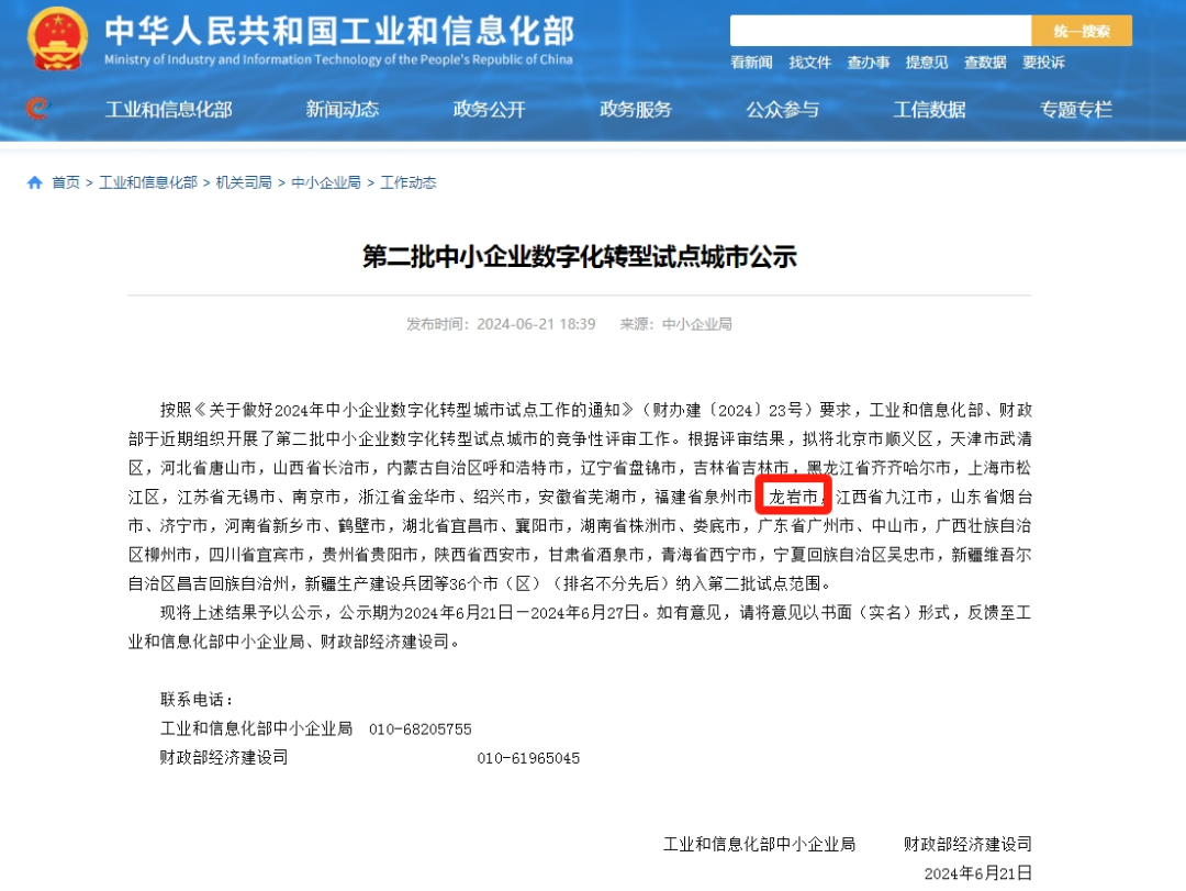 龍巖市是第二批中小企業(yè)數(shù)字化轉型試點城市,6月21日工信部、財政部對入選第二批中小企業(yè)數(shù)字化轉型試點城市名單進行公示,龍巖入選。標志著龍巖市在推動中小企業(yè)數(shù)字化轉型上邁出堅定步伐,并獲得國家認可。中央財政將對入選地級市給予1億元獎補資金,主要用于支持中小企業(yè)數(shù)字化改造、工業(yè)互聯(lián)網(wǎng)平臺建設、數(shù)字化服務商培育,以及支持開展咨詢診斷、人才培訓、數(shù)字化轉型融資等。