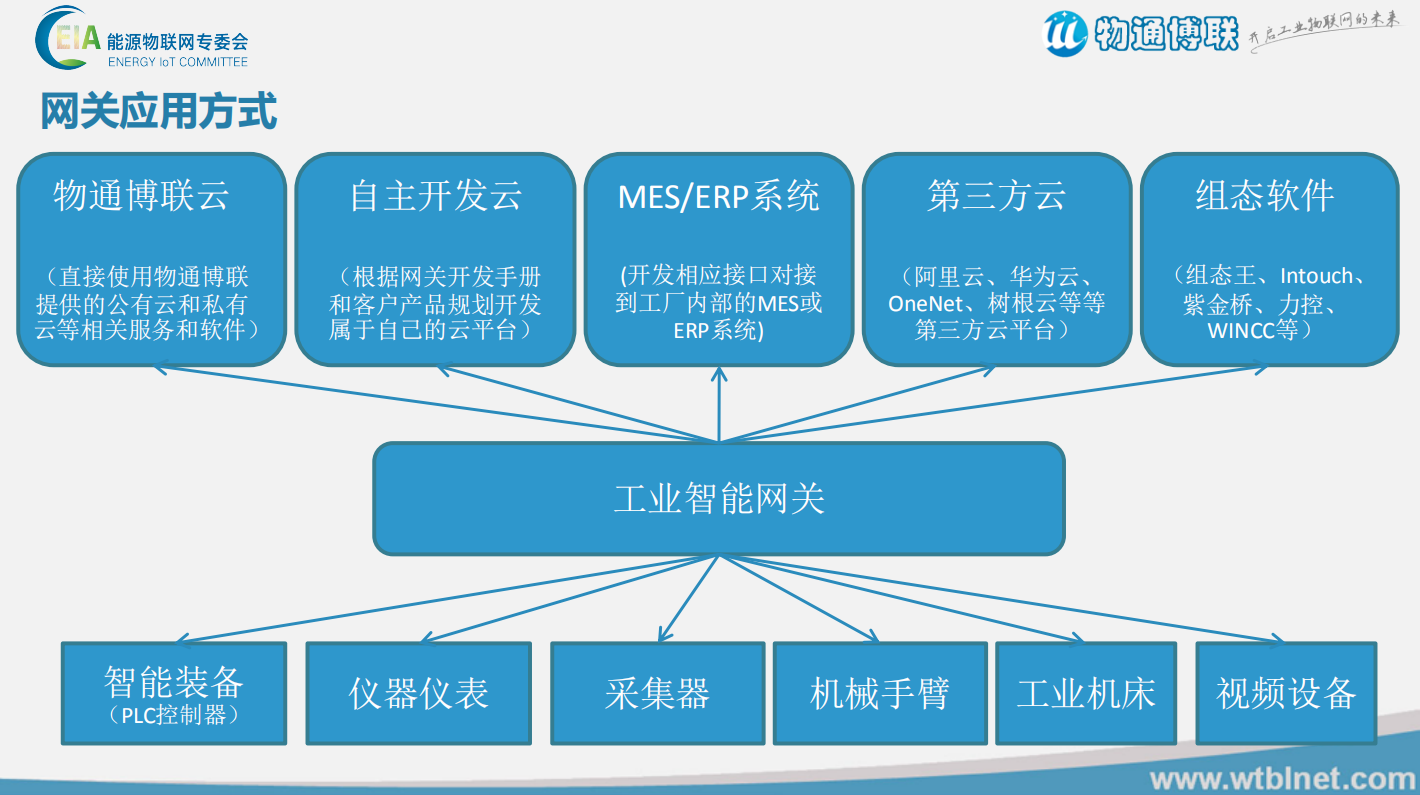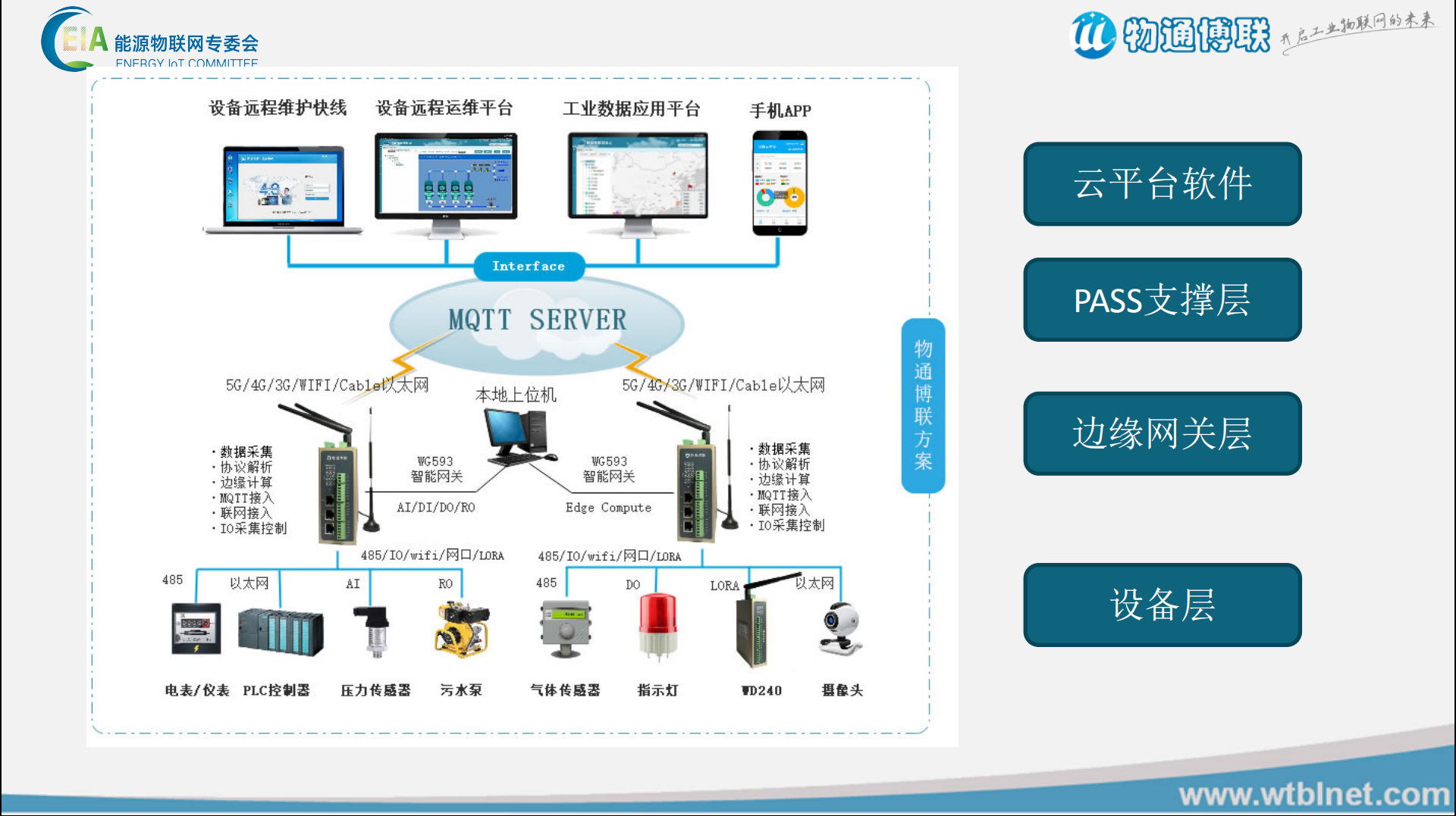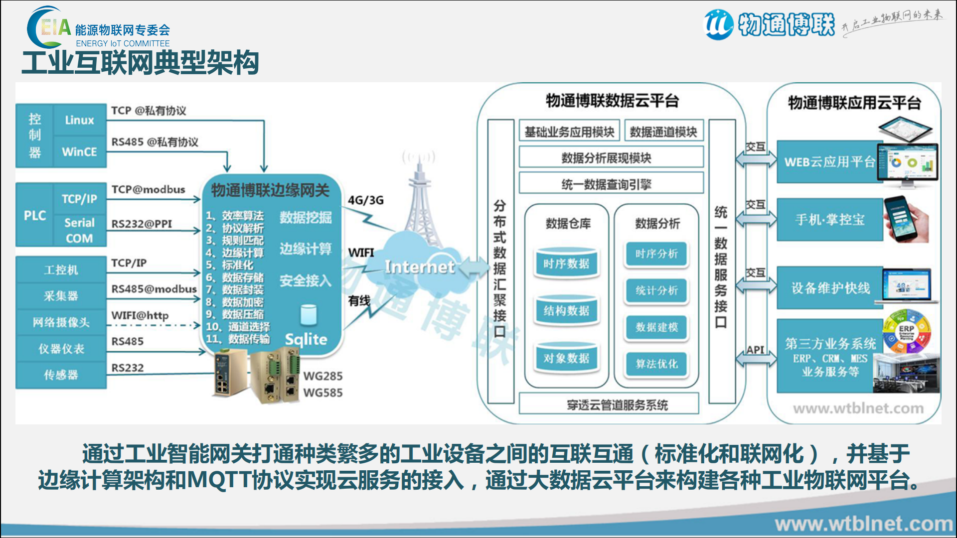 物通博聯(lián)·受邀國家能源互聯(lián)網(wǎng)產(chǎn)業(yè)及技術(shù)創(chuàng)新聯(lián)盟大講堂《能源物聯(lián)網(wǎng)》 時間:2020-09-02 17:22:22 2020年8月28日,物通博聯(lián)受邀國家能源互聯(lián)網(wǎng)產(chǎn)業(yè)及技術(shù)創(chuàng)新聯(lián)盟(CEIA)、CEIA能源物聯(lián)網(wǎng)專委會、CEIA能源數(shù)字化專委會,做專場《能源互聯(lián)網(wǎng)的設(shè)備聯(lián)網(wǎng)方案與應(yīng)用》的演講。為能源領(lǐng)域的從業(yè)者分享關(guān)于能源互聯(lián)網(wǎng)領(lǐng)域的物聯(lián)網(wǎng)解決方案和物聯(lián)網(wǎng)產(chǎn)品。 2016年8月,國家能源局批復(fù)成立國家能源互聯(lián)網(wǎng)產(chǎn)業(yè)及技術(shù)創(chuàng)新聯(lián)盟(國能科技[2016]222號),由清華大學(xué)牽頭做好國家能源互聯(lián)網(wǎng)產(chǎn)業(yè)及技術(shù)創(chuàng)新聯(lián)盟的各項組織籌備工作。 物通博聯(lián)成立于2011年是國內(nèi)專注于工業(yè)4.0應(yīng)用、工業(yè)物聯(lián)網(wǎng)產(chǎn)品研發(fā)的高科技企業(yè),在能源互聯(lián)網(wǎng)也深耕多年,特別在國家電網(wǎng)、北方供熱和智能工廠信息化建設(shè)中有豐富的經(jīng)驗和成功案例。 能源互聯(lián)網(wǎng)是新能源技術(shù)跟信息技術(shù)的深入結(jié)合為特征而催生的一種新的能源利用體系,它將能源生產(chǎn),能源消費有機(jī)結(jié)合在一起。其中物聯(lián)是基礎(chǔ),采用先進(jìn)的傳感器、智能的工業(yè)網(wǎng)關(guān)、智慧化的控制和軟件系統(tǒng),將能源生產(chǎn)端、能源消費端數(shù)以億計的設(shè)備、機(jī)器和系統(tǒng)連接起來,形成整套系統(tǒng);通過大數(shù)據(jù)、機(jī)器學(xué)習(xí)和預(yù)測提供能源效率和用能的利用率。 本次物通博聯(lián)演講主要從能源物聯(lián)網(wǎng)的需求分析、系統(tǒng)架構(gòu)、物聯(lián)產(chǎn)品和應(yīng)用案例四個方面進(jìn)行介紹分享。 能源是工業(yè)血液,伴隨工業(yè)4.0技術(shù)的應(yīng)用,能源互聯(lián)網(wǎng)也是重要組成部分。 典型的工業(yè)互聯(lián)網(wǎng)架構(gòu)(現(xiàn)場設(shè)備+工業(yè)網(wǎng)關(guān)+PASS平臺+SAAS平臺) 邊緣計算和云端計算協(xié)同,通過智能化的網(wǎng)關(guān)實現(xiàn)數(shù)據(jù)采集,通過智慧化的平臺實現(xiàn)分析 供熱系統(tǒng)的組成(熱源廠+換熱站+熱用戶) 電網(wǎng)的組成(發(fā)電+變電+配電+用電) 物聯(lián)網(wǎng)無線技術(shù)演進(jìn)(1G+2G+3G+4G+5G) 物聯(lián)網(wǎng)終端分類(Dtu->Rtu->Router->Gateway->Gatway+) 網(wǎng)關(guān)對接云平臺功能(物通博聯(lián)云平臺+自主開發(fā)云平臺、MES平臺、阿里平臺、組態(tài)王) 物通博聯(lián)·物聯(lián)網(wǎng)終端的介紹: 工業(yè)云網(wǎng)關(guān)(各種設(shè)備數(shù)據(jù)采集、4G/WIFI/以太網(wǎng)/5G /LORA聯(lián)網(wǎng),各種云平臺接入) 邊緣計算網(wǎng)關(guān)(邊緣計算、PLC數(shù)采、電表數(shù)集、水表數(shù)采、電力設(shè)備數(shù)采、IO采集) 物通博聯(lián)是一家工業(yè)智能化產(chǎn)品及應(yīng)用服務(wù)提供商,專注于為設(shè)備制造商、智能工廠及行業(yè)項目等領(lǐng)域提供智能網(wǎng)關(guān)、設(shè)備快線及應(yīng)用云平臺產(chǎn)品及方案。憑借在兩化融合、設(shè)備聯(lián)網(wǎng)、邊緣計算、大數(shù)據(jù)分析及工業(yè)建模等核心技術(shù)的積淀和優(yōu)勢,物通博聯(lián)作為工業(yè)4.0的先行者,產(chǎn)品得到國內(nèi)外頂級客戶和廣大中小企業(yè)的青睞,為客戶提供整體智能化解決方案,協(xié)助客戶實現(xiàn)數(shù)字化運營管理和工業(yè)互聯(lián)網(wǎng)新價值挖掘。 附: 【CEIA能源互聯(lián)網(wǎng)大講堂】第37期 回放視頻 演講主題:能源互聯(lián)網(wǎng)的設(shè)備物聯(lián)網(wǎng)方案及應(yīng)用 演講嘉賓:廈門物通博聯(lián)網(wǎng)絡(luò)科技有限公司 劉明德 視頻鏈接:https://v.qq.com/x/page/a3145t8271l.html 內(nèi)容大綱: 1、能源互聯(lián)網(wǎng)的需求分析 2、能源互聯(lián)網(wǎng)的系統(tǒng)架構(gòu) 3、能源互聯(lián)網(wǎng)的產(chǎn)品介紹 4、能源互聯(lián)網(wǎng)的應(yīng)用分享 上一篇:物通博聯(lián)作為工業(yè)互聯(lián)網(wǎng)先行者,受邀參加2020數(shù)字中國峰會及《工業(yè)互聯(lián)網(wǎng)論壇》 下一篇: 物通博聯(lián)在廈門兩岸股權(quán)交易中心 “閩西南科技板”成功掛牌 相關(guān)推薦 向新求質(zhì)|物通博聯(lián)獲評2024發(fā)展新質(zhì)生產(chǎn)力“影響力企業(yè)”,總經(jīng)理劉明德獲評2024發(fā)展新質(zhì)生產(chǎn)力“領(lǐng)軍人物” 2025-04-25 邀請函丨物通博聯(lián)邀您相約福州國際數(shù)字產(chǎn)品博覽會 2025-04-17 新起點,新征程|物通博聯(lián)喬遷盛典圓滿舉行,開啟未來新篇章! 2025-04-17 【邀請函】物通博聯(lián)誠邀您蒞臨深圳國際傳感器與應(yīng)用技術(shù)展覽會! 2025-03-26 相關(guān)產(chǎn)品 工業(yè)智能網(wǎng)關(guān) 物通博聯(lián)·WG系列工業(yè)智能網(wǎng)關(guān)是一款支持采集各種PLC,儀器儀表,水環(huán)保,電力設(shè)備,CNC等各種工業(yè)設(shè)備數(shù)據(jù),具有協(xié)議解析,邊緣計算的高可靠性工業(yè)智能網(wǎng)關(guān),是構(gòu)... 工業(yè)數(shù)采終端 物通博聯(lián)·WD系列工