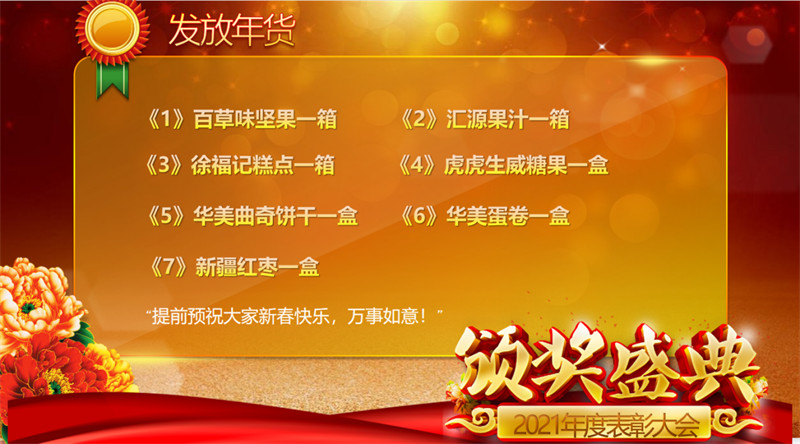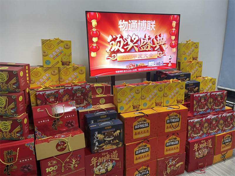 2、物通博聯(lián)為每個(gè)員工準(zhǔn)備了豐盛的年貨和晚宴,每個(gè)人人均10箱的年貨。
