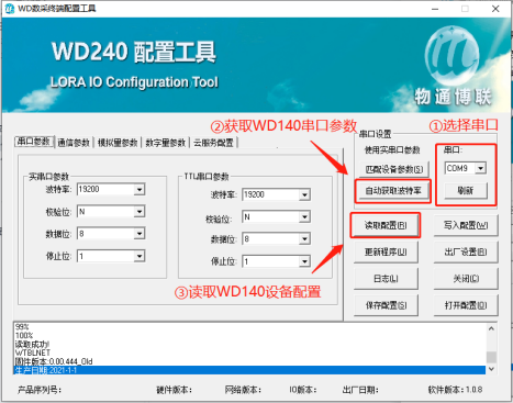 打開配置工具,選擇相應(yīng)的串口,點擊“自動獲取波特率”,獲取成功后點擊“讀取配置”。