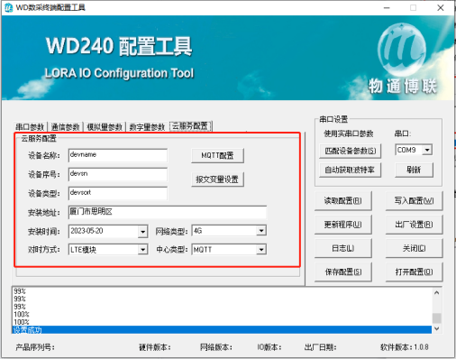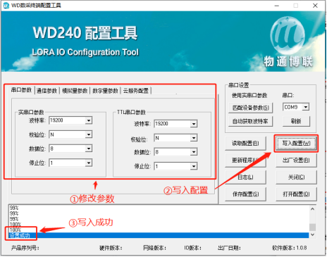 可以通過配置工具修改WD140設(shè)備的串口參數(shù)以及通訊參數(shù)(相關(guān)配置的說明請繼續(xù)閱讀此文檔),修改完成后點擊“寫入配置”,等待下方提示寫入成功后即可。