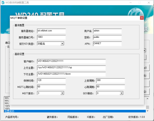 設(shè)置好基本參數(shù)后,點擊“MQTT配置”,配置MQTT服務(wù)器的IP地址,端口以及上下行主題(Topic)等參數(shù),如下圖: