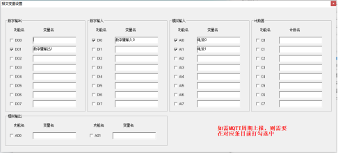 注:如果需要配置串口數(shù)據(jù)透傳到MQTT服務(wù)器,只需要在上下行主題加入“trans”字樣即可,主題中含有“trans”即代表網(wǎng)關(guān)為透傳模式。配置好MQTT參數(shù)后,關(guān)閉子窗口,點擊“報文變量設(shè)置”,可自定義變量名稱,可按需設(shè)置需要上報的點位,在需要上報的點位名稱前面打鉤即可,如下圖: