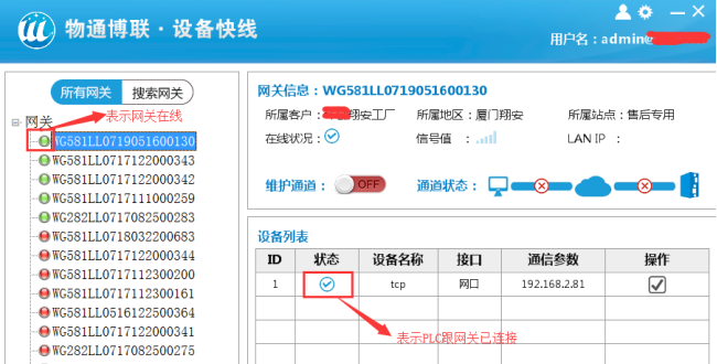 點(diǎn)擊建立通道,如果該網(wǎng)關(guān)沒有其他維護(hù)工程師在維護(hù),就會建立起通道,通道建立后,就可以使用PLC編程軟件或者其他組態(tài)軟件對遠(yuǎn)程操作設(shè)備。