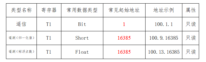 變量配置主要定義變量名(任意)、變量別名(任意)、寄存器類型(固定選擇T1)、變量類型和寄存器偏移地址(例如100.1.2,其中100為固定,1為單點(diǎn)遙信類型標(biāo)識(shí),2為點(diǎn)位序號(hào))。