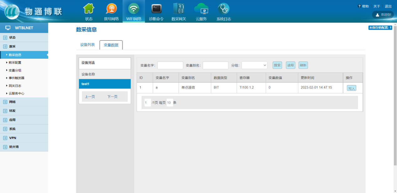 數(shù)采配置(設(shè)備信息+變量參數(shù))完成后,重啟采集程序并生效配置,即可在:數(shù)采信息---變量數(shù)據(jù)---設(shè)備名稱 中看到采集上來的數(shù)據(jù)。