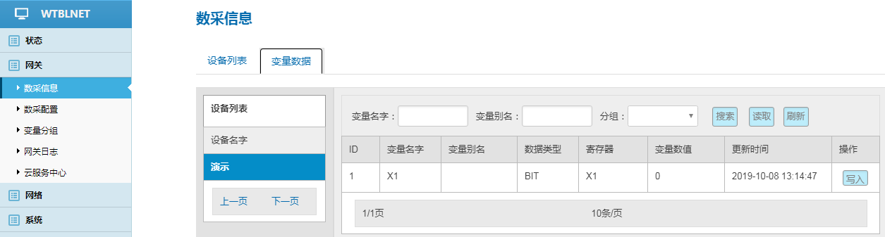 數(shù)采配置(設(shè)備信息+變量參數(shù))完成后,重啟采集程序并生效配置,即可在:數(shù)采信息---變量數(shù)據(jù)---設(shè)備名稱 中看到采集上來的數(shù)據(jù)。