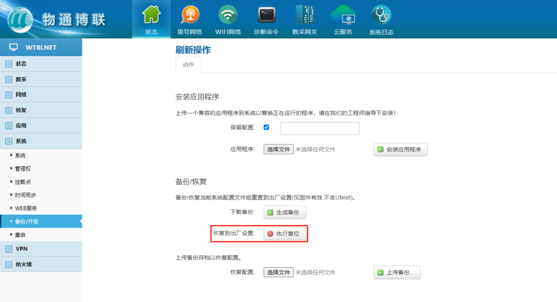 下載中心 視頻中心 常見問題 售后服務(wù) 工業(yè)網(wǎng)關(guān) 設(shè)備快線 數(shù)據(jù)云平臺 聯(lián)網(wǎng)設(shè)備 問答百科 工業(yè)智能網(wǎng)關(guān)如何進行軟硬件復(fù)位? 時間:2022-10-26 09:13:38 點擊:4700 關(guān)鍵詞:工業(yè)智能網(wǎng)關(guān),網(wǎng)關(guān)復(fù)位,網(wǎng)關(guān)重啟 問題:工業(yè)智能網(wǎng)關(guān)如何進行軟硬件復(fù)位? 回答: (1)硬件復(fù)位 首先斷電后再通電重啟設(shè)備網(wǎng)關(guān),當網(wǎng)關(guān)指示燈STATUS和WARN交替閃爍后,立即長按RESET鍵,直到ERROR燈慢閃后松開(或3秒后松開),再次長按RESET鍵,直到ERROR燈快閃后松開按鈕(或3秒后松開),網(wǎng)關(guān)開始復(fù)位 (2)軟件復(fù)位 系統(tǒng)——備份/升級——恢復(fù)到出廠設(shè)置 上一篇:工業(yè)智能網(wǎng)關(guān)如何設(shè)置靜態(tài)固定IP? 下一篇: 工業(yè)智能網(wǎng)關(guān)和DTU有什么區(qū)別嗎?