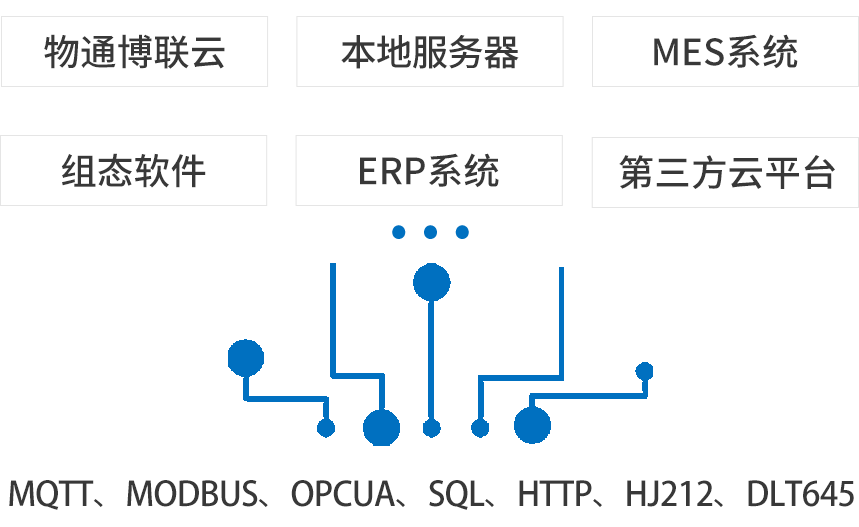 北向支持接入物通博聯(lián)云平臺,客戶自主開發(fā)的云平臺,第三方云平臺(根云、美云、華為、阿里、百度、微軟等IOT云平臺),組態(tài)軟件、MES系統(tǒng)、行業(yè)監(jiān)控平臺等工業(yè)軟件