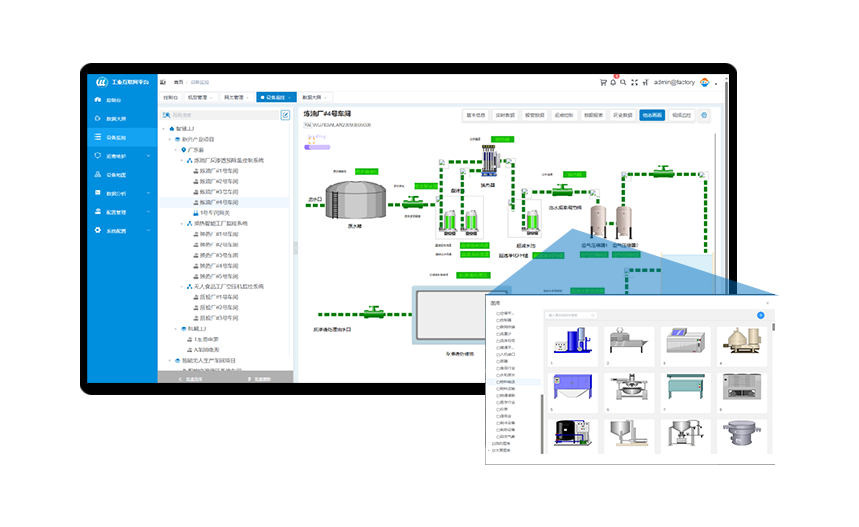 通過將網(wǎng)關(guān)的數(shù)據(jù)接入到物通博聯(lián)工業(yè)數(shù)據(jù)云平臺,可以實現(xiàn)對注塑機的數(shù)據(jù)進行遠程監(jiān)控,通過平臺的組態(tài)功能可以自由繪制組態(tài)監(jiān)控畫面,實現(xiàn)電腦端和手機端的設(shè)備運行狀態(tài)和工藝流程的可視化組態(tài)監(jiān)控。