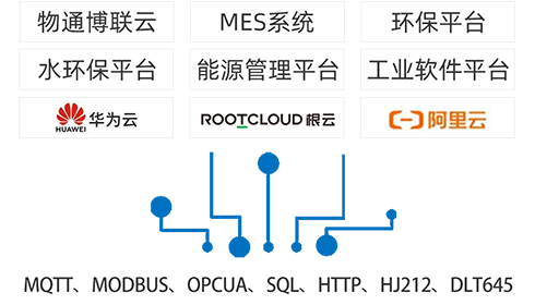 支持通過MQTT、MODBUS、OPCUA、SQL、HTTP數(shù)據(jù)庫等方式接入遠端軟件平臺(包含:物通博聯(lián)云平臺,客戶自主開發(fā)的云平臺,根云、美云、華為、阿里、百度、微軟等IOT云平臺,組態(tài)軟件、MES系統(tǒng)、ERP系統(tǒng)等工業(yè)軟件)