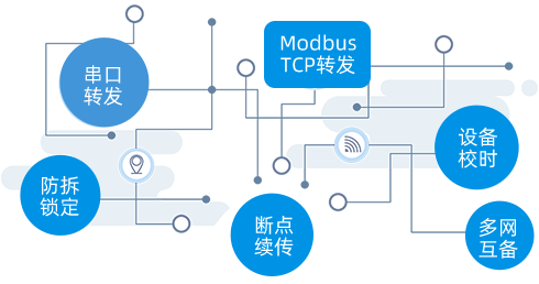 串口轉(zhuǎn)發(fā)、Modbus TCP轉(zhuǎn)發(fā)、設(shè)備校時、防拆鎖定、斷點續(xù)傳,多網(wǎng)互備等等