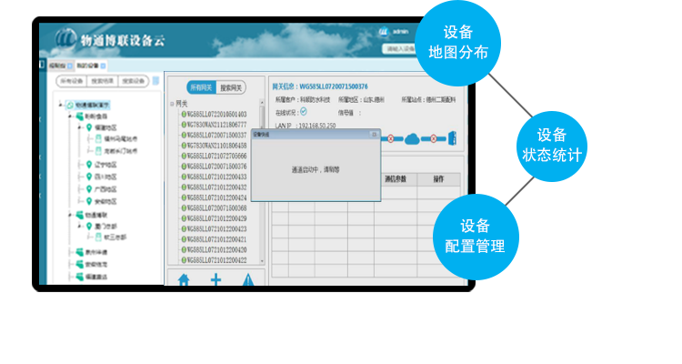 具有設(shè)備地圖展現(xiàn)、設(shè)備狀態(tài)統(tǒng)計、設(shè)備遠程配置、設(shè)備遠程管理等功能,實現(xiàn)對分布在全球各地的工業(yè)設(shè)備進行遠程運營管理。
