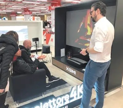 消費者在極米科技位于意大利米蘭一家電器商場的快閃店體驗投影儀產(chǎn)品。 鄒 成攝