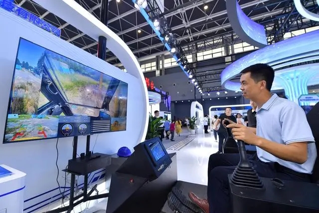 9月7日,參觀者在本屆數(shù)博會上體驗挖掘機5G遠程駕駛系統(tǒng)。新華社記者 駱學峰 攝