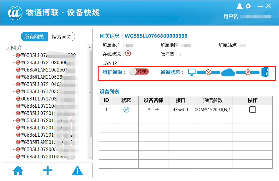 登錄設(shè)備快線,選擇一臺(tái)需要維護(hù)的在線網(wǎng)關(guān),點(diǎn)擊建立通道。等到通道狀態(tài)都是綠色打鉤后就證明通道建立完成,以太網(wǎng)設(shè)備可以通過ping來測(cè)試通道情況。
