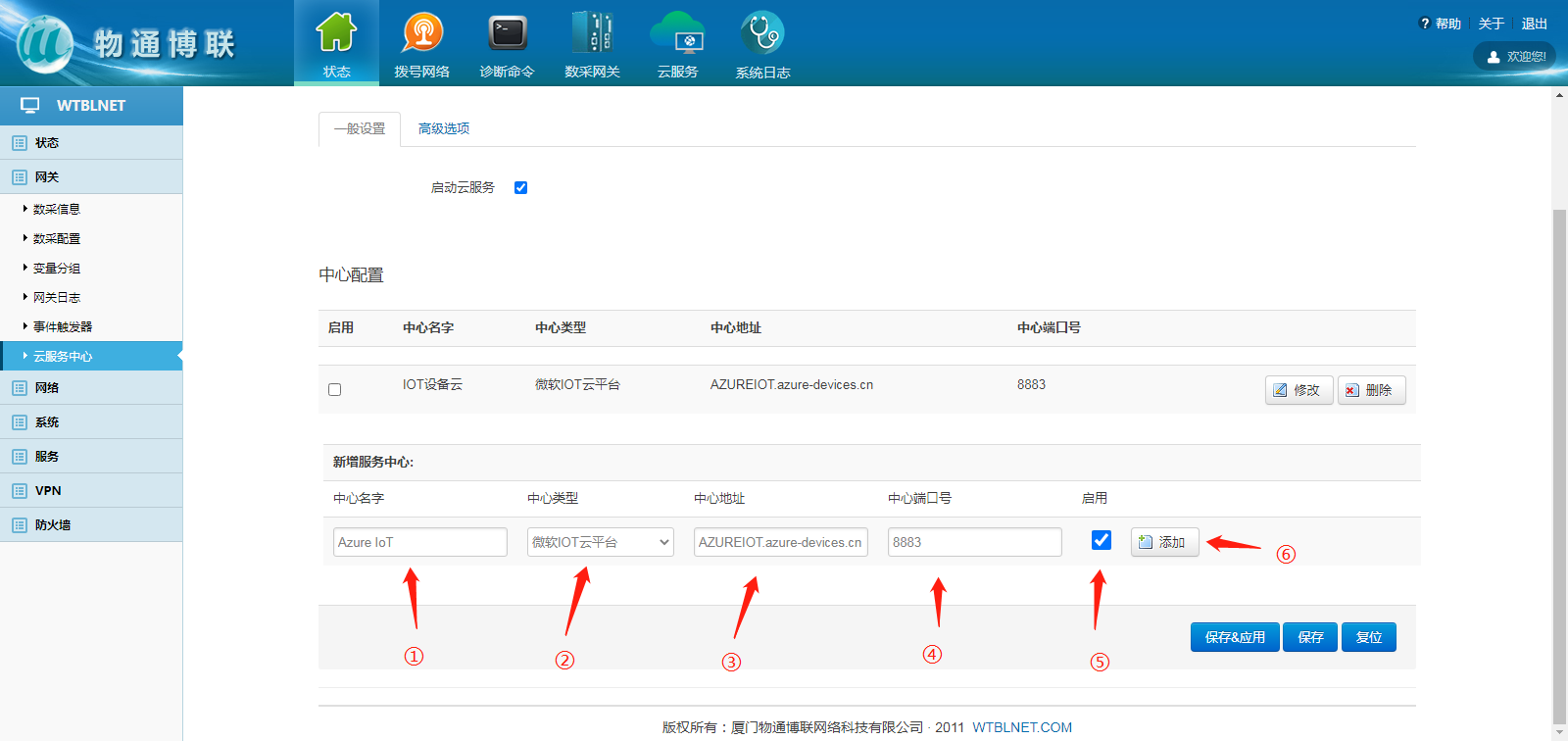 3、打開(kāi)物通博聯(lián)網(wǎng)關(guān)WEB界面,新建一個(gè)連接中心,中心類(lèi)型選擇微軟IoT云平臺(tái),輸入相應(yīng)信息,勾選啟用,點(diǎn)擊“添加” ,填寫(xiě)對(duì)應(yīng)數(shù)據(jù)即可實(shí)現(xiàn)設(shè)備數(shù)據(jù)上傳到微軟Azure IoT物聯(lián)網(wǎng)平臺(tái)。