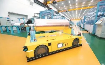 圖為在浙江花園新能源股份有限公司銅箔生箔車間內(nèi),自動(dòng)導(dǎo)引車(AGV)正在協(xié)助生產(chǎn)車間完成自動(dòng)取放卷及跨車間轉(zhuǎn)運(yùn)成品等。包康軒攝(人民視覺)