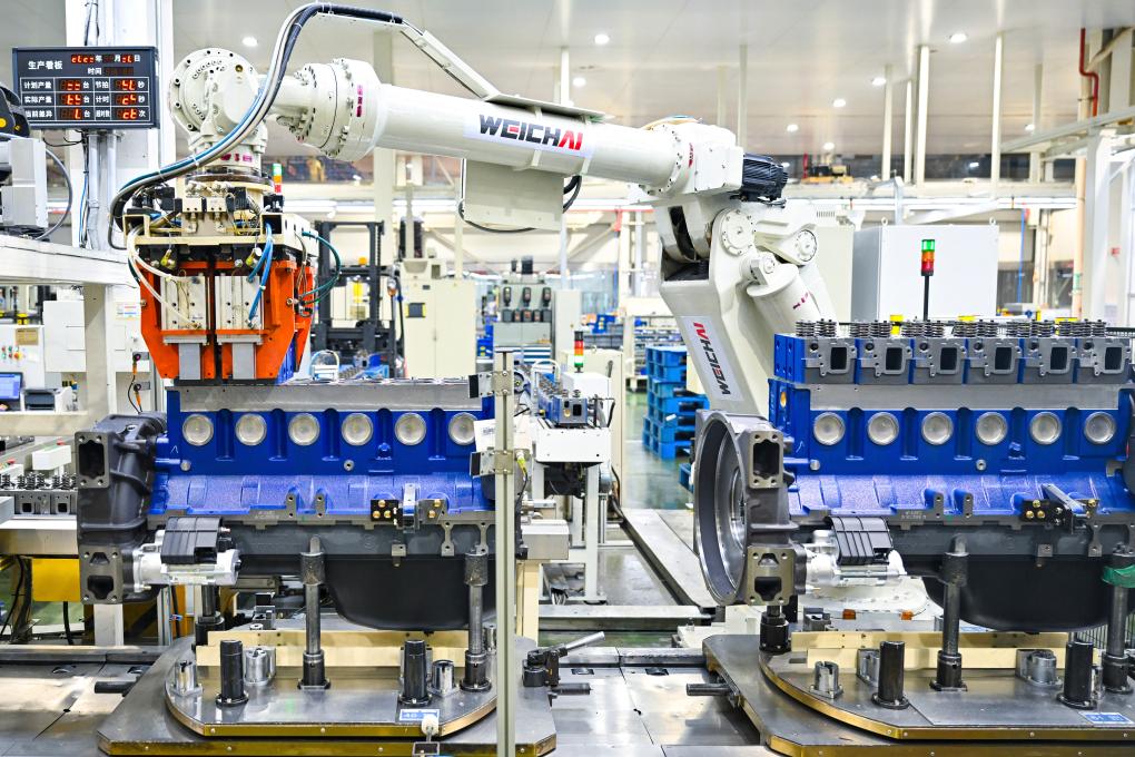 在濰柴動(dòng)力股份有限公司總裝生產(chǎn)線,機(jī)器人在裝配清潔能源發(fā)動(dòng)機(jī)。新華社發(fā)(孫國(guó)祥 攝)