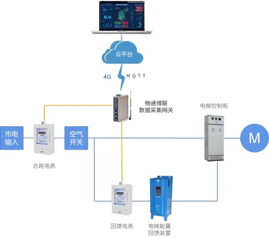 通過將物通博聯(lián)工業(yè)智能網(wǎng)關(guān)接入電梯電表中(一般為2個電表,一個是在空氣開關(guān)前的市電輸入電表,一個是電梯能量回饋裝置出線位置的電表),采集電梯耗電量、回能發(fā)電量等數(shù)據(jù)并通過4G網(wǎng)絡(luò)對接到樓宇節(jié)能管理平臺或制造商管理平臺中,從而對節(jié)能優(yōu)化工作有準(zhǔn)確的數(shù)據(jù)決策支持,更好評估電梯節(jié)能效益。