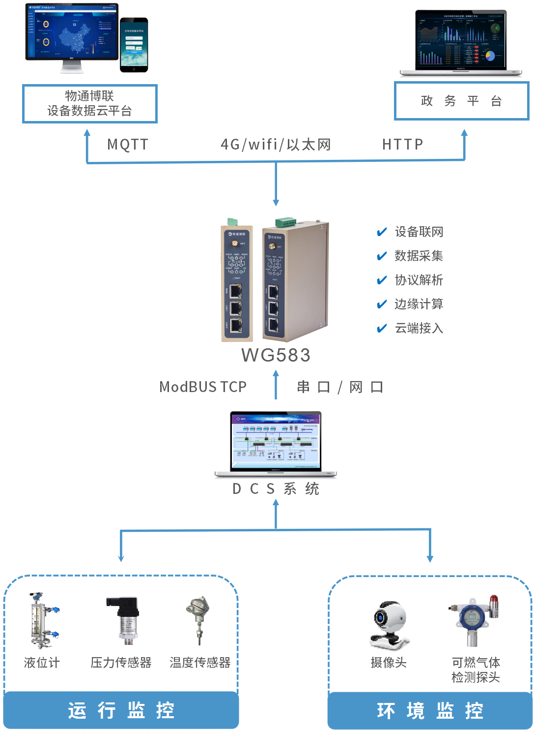數(shù)據(jù)采集網(wǎng)關(guān),構(gòu)建“多源感知邊緣計(jì)算云端協(xié)同”的工業(yè)儲(chǔ)罐安全監(jiān)測(cè)物聯(lián)網(wǎng)系統(tǒng)。通過在儲(chǔ)罐關(guān)鍵部位部署智能傳感器(壓力計(jì)、溫濕度傳感器、液位計(jì)等),利用網(wǎng)關(guān)的協(xié)議解析與邊緣計(jì)算能力實(shí)現(xiàn)傳感器數(shù)據(jù)采集與本地預(yù)處理,通過 5G、4G、以太網(wǎng)等網(wǎng)絡(luò)傳輸至云端管理平臺(tái)。管理人員可通過電腦、手機(jī)等終端,隨時(shí)隨地查看儲(chǔ)罐運(yùn)行狀態(tài),接收異常報(bào)警信息,并進(jìn)行遠(yuǎn)程管理和決策,有效提升工業(yè)儲(chǔ)罐的安全管理水平。
