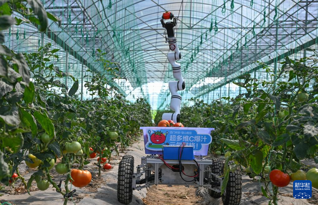 6月12日,重慶璧山番茄小鎮(zhèn)·果琳基地內(nèi),機(jī)器人自動(dòng)摘取成熟的番茄。新華社記者 陳誠(chéng) 攝