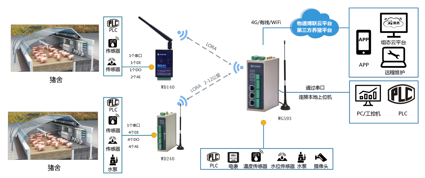通過(guò)將風(fēng)機(jī)、水泵、卷簾等設(shè)備PLC以及溫濕度、有害氣體等傳感器接入物通博聯(lián)工業(yè)智能網(wǎng)關(guān)中,網(wǎng)關(guān)能夠?qū)崟r(shí)采集殖設(shè)備的開(kāi)關(guān)、電壓、電流、溫度、濕度、光照強(qiáng)度、氣體濃度等數(shù)據(jù)并通過(guò)5G/4G/WIFI/以太網(wǎng)等方式對(duì)接到設(shè)備管理系統(tǒng)平臺(tái)中,從而實(shí)現(xiàn)可視化展示,實(shí)現(xiàn)對(duì)各個(gè)設(shè)備的集中江湖與在線(xiàn)管理,確保養(yǎng)殖安全并提高工作效率。