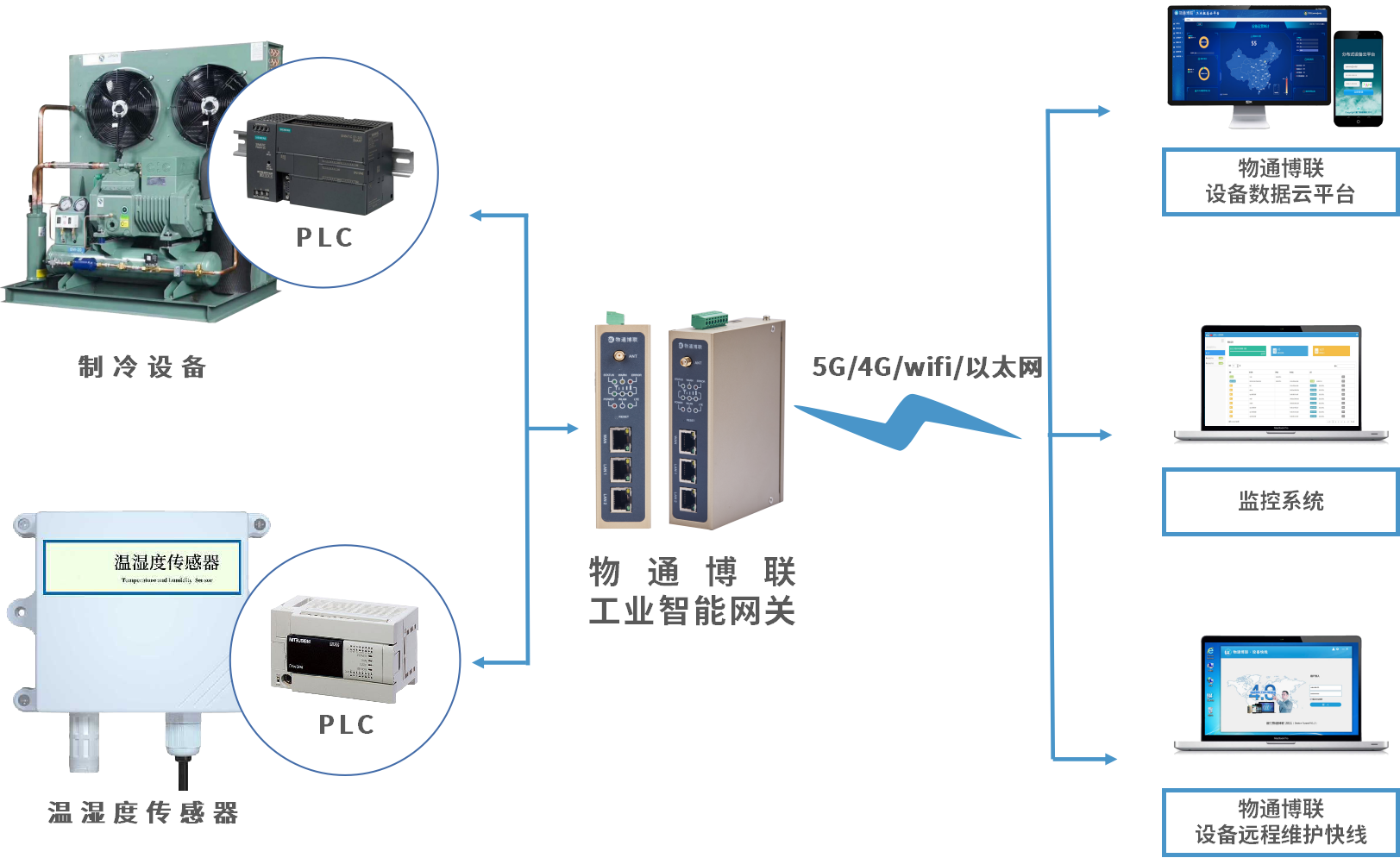 該冷庫配置了兩臺(tái)制冷機(jī),每臺(tái)制冷機(jī)分別由一臺(tái)室外機(jī)組和室內(nèi)風(fēng)機(jī)組成,通過一臺(tái)匯川PLC實(shí)現(xiàn)自動(dòng)化控制,實(shí)現(xiàn)兩臺(tái)機(jī)組的定時(shí)開關(guān)切換,同時(shí)確保溫度控制在4~12℃度內(nèi)?,F(xiàn)要求實(shí)現(xiàn)制冷機(jī)數(shù)據(jù)采集到工廠管理平臺(tái)中,實(shí)現(xiàn)實(shí)時(shí)監(jiān)控與遠(yuǎn)程開關(guān)控制。對此,物通博聯(lián)提供基于工業(yè)智能網(wǎng)關(guān)的PLC數(shù)據(jù)采集物聯(lián)網(wǎng)解決方案。