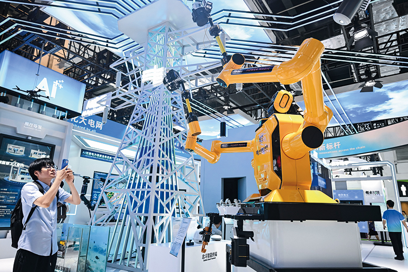 參觀者在上海市舉辦的 2025 世界人工智能大會展覽現(xiàn)場中國南方電網(wǎng)展區(qū)拍攝“悟空”帶電作業(yè)機器人(2025 年7 月 28 日攝)陳浩明攝 / 本刊