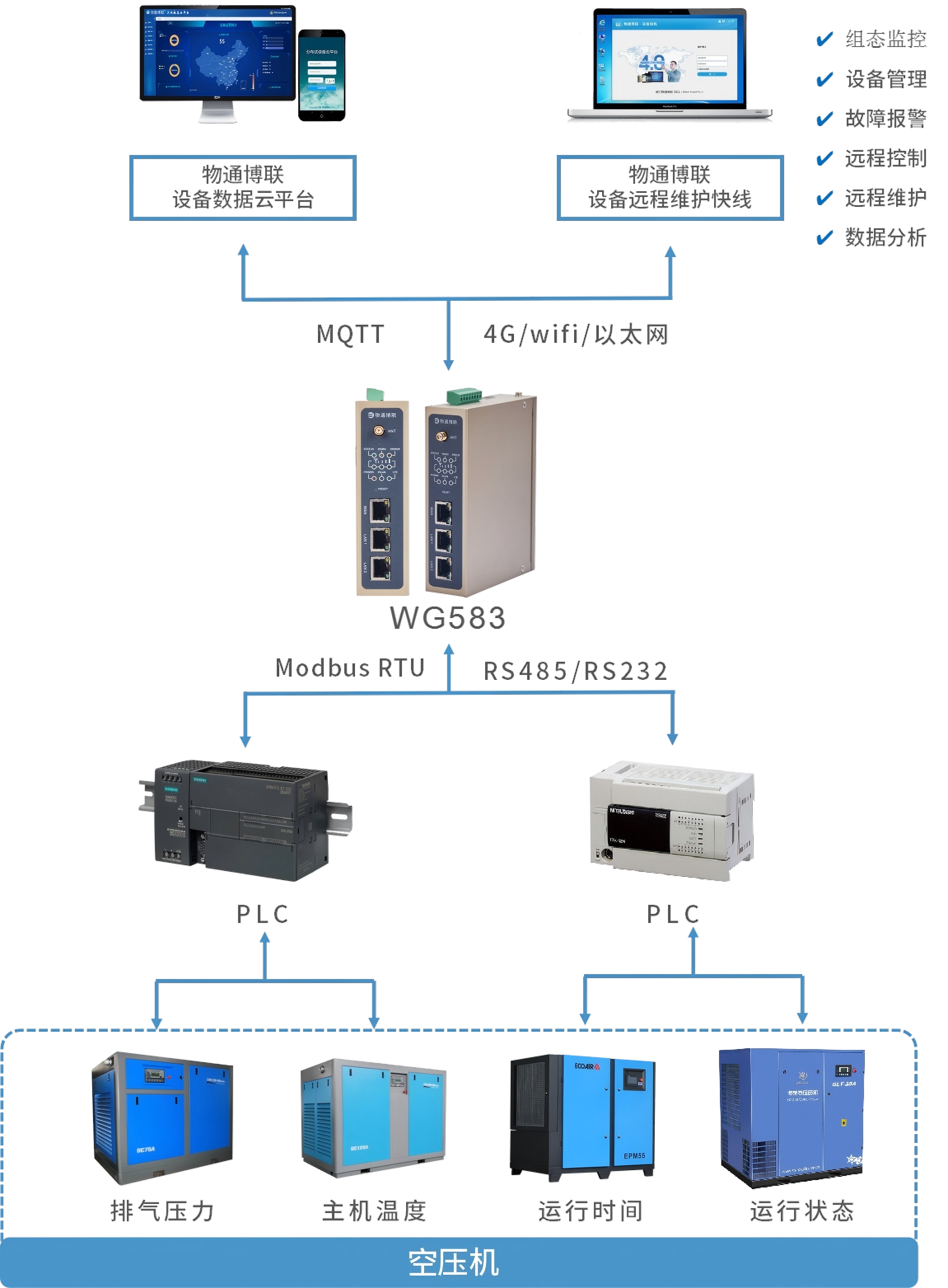 對此,物通博聯(lián)部署工業(yè)智能網(wǎng)關(guān)接入DCS系統(tǒng),能夠?qū)崟r采集空壓機運行狀態(tài)與工藝參數(shù),并通過4G網(wǎng)絡(luò)對接到工業(yè)物聯(lián)網(wǎng)云平臺中,從而實時監(jiān)控兩臺空壓機的運行狀態(tài)(手動、自動、維護(hù))與工藝參數(shù)(壓力、流量、溫度、運行時間、電壓電流等),并在超出閾值時自動告警,及時遠(yuǎn)程控制與管理,能夠避免出現(xiàn)意外重大事故,確保生產(chǎn)安全。