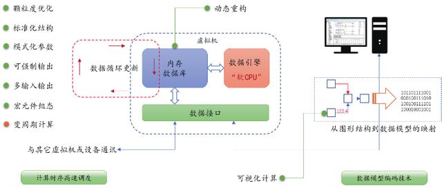 因此,需要一種數(shù)據(jù)庫(kù)的計(jì)算機(jī)制。這個(gè)功能由圖3中的數(shù)據(jù)引擎模塊完成。內(nèi)存數(shù)據(jù)庫(kù)中包含靜態(tài)與動(dòng)態(tài)兩種數(shù)據(jù),數(shù)據(jù)引擎利用其中的靜態(tài)數(shù)據(jù)做驅(qū)動(dòng),完成其動(dòng)態(tài)數(shù)據(jù)的更新。為了讓工業(yè)互聯(lián)網(wǎng)的平臺(tái)能夠滿足工程技術(shù)人員開(kāi)發(fā)相關(guān)應(yīng)用和未來(lái)社區(qū)生態(tài)的建設(shè)與發(fā)展的要求,我們引入了圖計(jì)算技術(shù)。應(yīng)用開(kāi)發(fā)人員可以利用圖計(jì)算工具來(lái)構(gòu)建相關(guān)算法的圖結(jié)構(gòu)。這種結(jié)構(gòu)具有相對(duì)比較直觀的邏輯關(guān)系,它還能夠通過(guò)自動(dòng)編譯技術(shù),將圖形結(jié)構(gòu)映射為特定的數(shù)據(jù)模型,從而實(shí)現(xiàn)工業(yè)互聯(lián)網(wǎng)應(yīng)用的無(wú)代碼開(kāi)發(fā)模式。借助這種圖形結(jié)構(gòu)與數(shù)據(jù)模型的映射關(guān)系,我們還可以輕松實(shí)現(xiàn)工業(yè)互聯(lián)網(wǎng)應(yīng)用計(jì)算的可視化和可動(dòng)態(tài)重構(gòu)的功能。