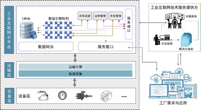 鑒于以上分析,我們提出一種面向服務(wù)的工業(yè)互聯(lián)網(wǎng)的架構(gòu)設(shè)計(jì),如圖4所示。其中,工業(yè)互聯(lián)網(wǎng)的核心部分是云平臺(tái),除了數(shù)據(jù)庫(kù)和數(shù)據(jù)引擎陣列外,需要部署共享資源、運(yùn)維管理和開(kāi)發(fā)管理三個(gè)基本服務(wù)模塊。工廠設(shè)備的數(shù)據(jù)經(jīng)過(guò)邊緣層后送入云平臺(tái)的數(shù)據(jù)碼頭進(jìn)行緩存處理。云平臺(tái)的服務(wù)窗口用于工廠管理和生產(chǎn)各項(xiàng)應(yīng)用的響應(yīng),即應(yīng)用的可視化窗口。作為工業(yè)互聯(lián)網(wǎng)的第三方,技術(shù)服務(wù)提供方的主要任務(wù)包括與企業(yè)用戶連接,處理企業(yè)的應(yīng)用需求,調(diào)用解決方案庫(kù),提供應(yīng)用開(kāi)發(fā)服務(wù)。另外通過(guò)云平臺(tái)的服務(wù)接口,獲取工業(yè)互聯(lián)網(wǎng)運(yùn)行狀態(tài)信息,提供運(yùn)維管理,確保工業(yè)互聯(lián)網(wǎng)與企業(yè)生產(chǎn)管理過(guò)程保持同步。