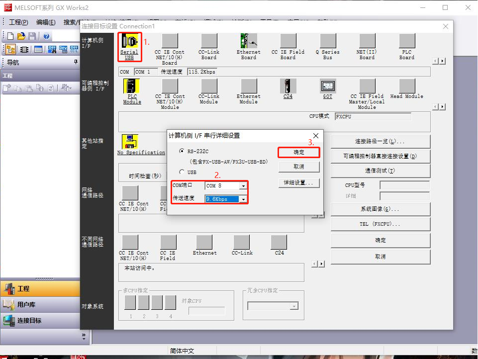 打開 MELSOFT系列 GX Works2,登錄 FX3UPLC,設(shè)置 FX3U 串口參數(shù),點(diǎn)擊“在線”——“PLC讀取”——“模塊參數(shù)”,具體設(shè)置見下圖: