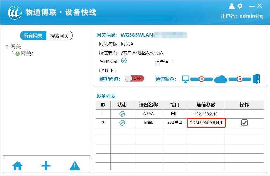 1、啟動 “設(shè)備快線客戶端軟件”軟件,通過官方提供的賬號密碼登錄。選擇在線網(wǎng)關(guān),不用打開維護(hù)通道,勾選設(shè)備列表的設(shè)備等待彈出串口透傳通道建立成功,點(diǎn)擊確認(rèn),遠(yuǎn)程維護(hù)完畢后需關(guān)閉通道。