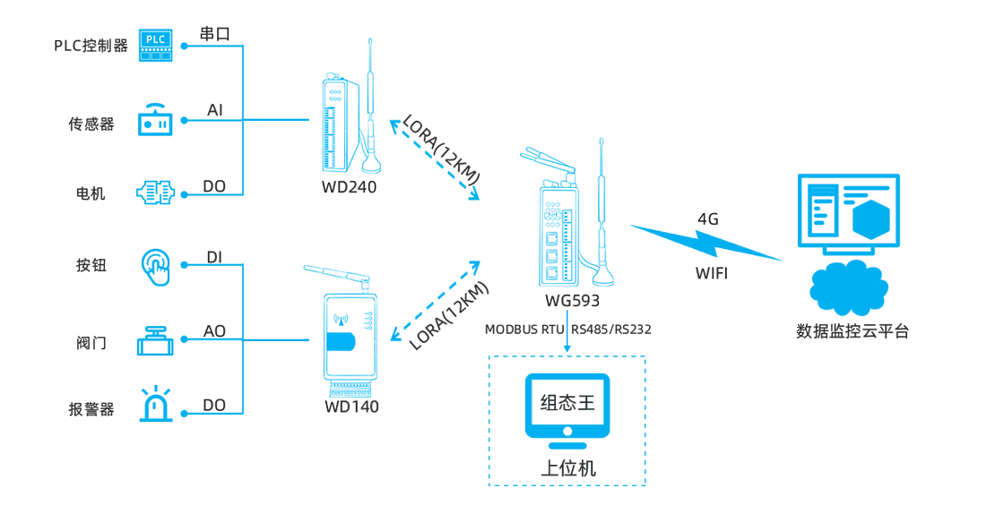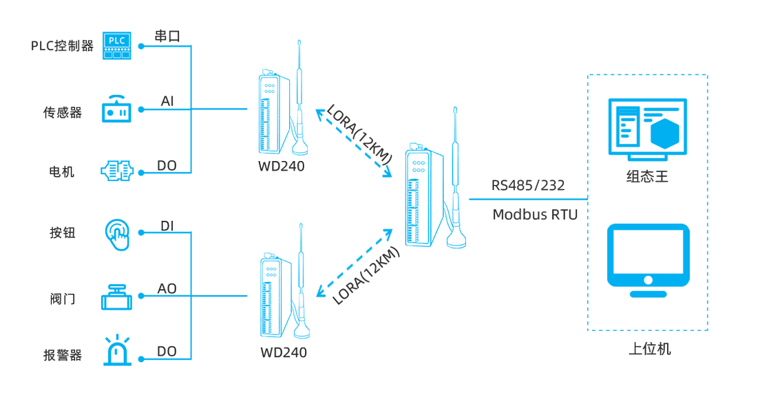 | 示例 | WD240-LM0844-485(8AI-4DI-4DO,國內(nèi)頻段:410~493MHz,485串口) WD240-LM0484-232(4DI-4AI-4DI-4RO,國內(nèi)頻段:410~493MHz,232串口) WD240-LM0448-485(4DO-4AI-4DI-4RO,國內(nèi)頻段:410~493MHz,485串口) WD240-LM2644-232(2AO-6AI-4DI-4RO,國內(nèi)頻段:410~493MHz,232串口) WD240-LM0844-485(8AI-4DI-4DO,海外頻段:850~930MHz,485串口) WD240-GM0844-485(8AI-4DI-4DO,4G CAT1,485串口)等 |