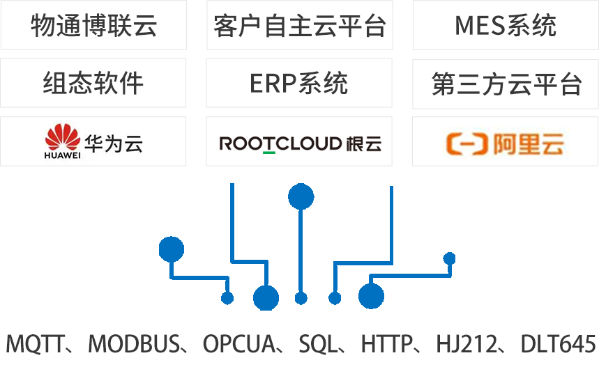 北向支持接入物通博聯(lián)云平臺(tái),客戶(hù)自主開(kāi)發(fā)的云平臺(tái),第三方云平臺(tái)(根云、美云、華為、阿里、百度、微軟等IOT云平臺(tái)),組態(tài)軟件、MES系統(tǒng)、ERP系統(tǒng)等工業(yè)軟件