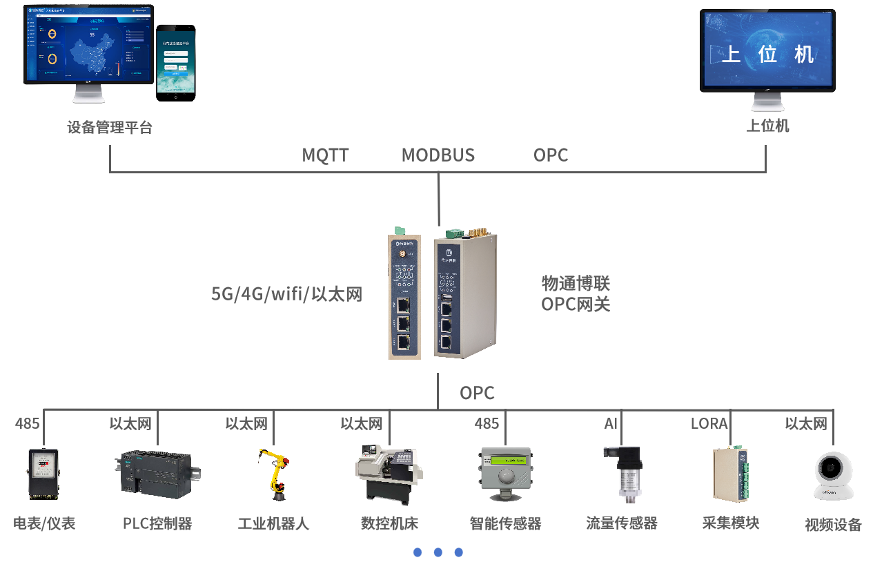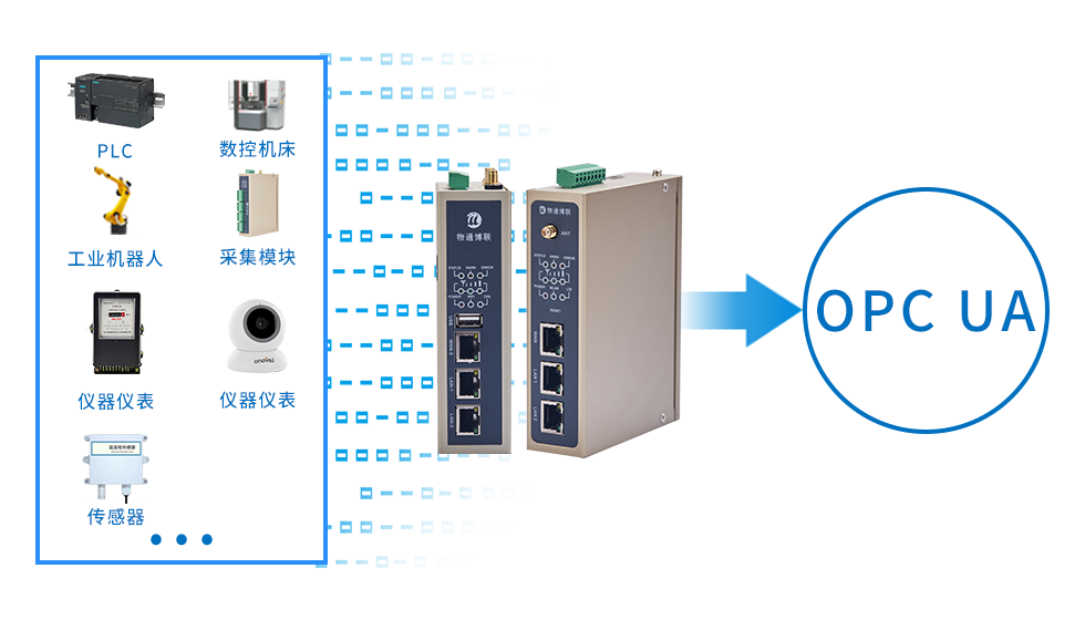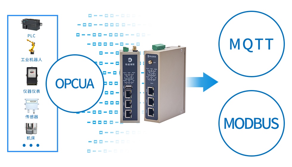 物通博聯(lián)OPC網(wǎng)關(guān)具有設(shè)備聯(lián)網(wǎng)、數(shù)據(jù)采集、協(xié)議解析、邊緣計(jì)算、云端接入等功能,支持OPC UA協(xié)議解析數(shù)據(jù)采集,能夠連接到PLC、儀器儀表、傳感器、數(shù)控機(jī)床、DCS、SCADA等,實(shí)時(shí)采集數(shù)據(jù)并通過(guò)Modbus/MQTT協(xié)議傳輸?shù)皆破脚_(tái)或本地上位機(jī),實(shí)現(xiàn)設(shè)備遠(yuǎn)程監(jiān)控、遠(yuǎn)程管理。