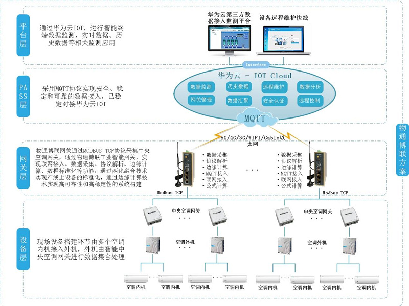 空調(diào)作為工廠智能化和數(shù)字化的重要組成部分,空調(diào)網(wǎng)關(guān)下行可以控制32臺空調(diào)內(nèi)機(jī),不管空凋外機(jī)是帶幾臺空調(diào)內(nèi)機(jī),有效的監(jiān)控,可以有效的節(jié)約能源。通過物通博聯(lián)提供的物聯(lián)網(wǎng)解決方案,能過實現(xiàn)對空調(diào)設(shè)備的的遠(yuǎn)程監(jiān)控,對分布在全國乃至全球各地的網(wǎng)關(guān)進(jìn)行遠(yuǎn)程監(jiān)控、遠(yuǎn)程配置、遠(yuǎn)程診斷和遠(yuǎn)程更新程序。整體解決方案組成部分;空調(diào)網(wǎng)關(guān)、物通博聯(lián)WG583工業(yè)智能網(wǎng)關(guān)、華為IOT云平臺、數(shù)據(jù)接入監(jiān)測云平臺、設(shè)備遠(yuǎn)程維護(hù)快線。