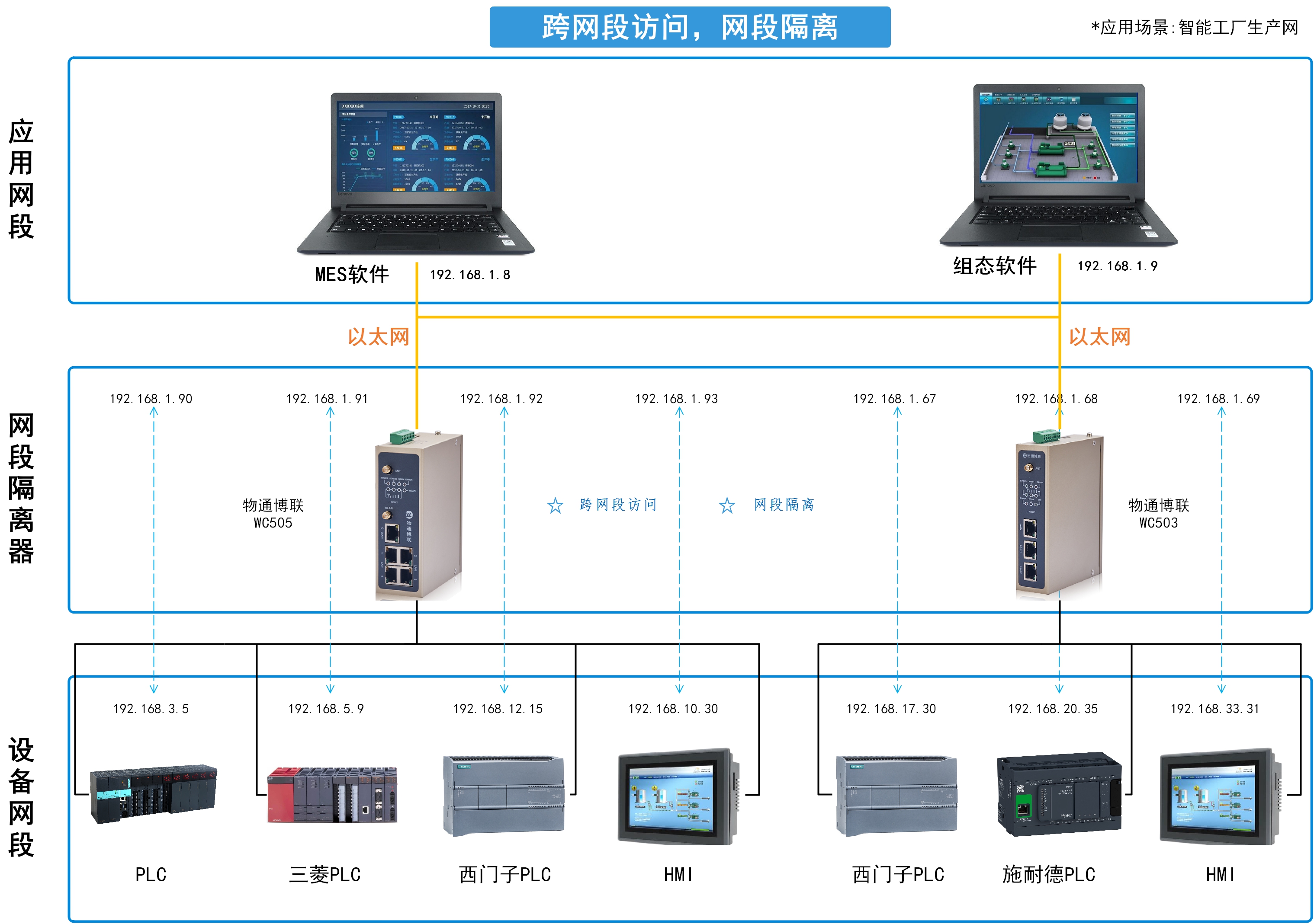WC503網(wǎng)段隔離器(NAT轉(zhuǎn)換網(wǎng)關(guān))適用于生產(chǎn)網(wǎng)絡對 PLC、HMI、CNC、DCS、MES等網(wǎng)絡通訊和數(shù)據(jù)采集,兼有跨網(wǎng)段隔離和IP轉(zhuǎn)換的功能。同時支持2臺以上設備(如PLC、CNC等)網(wǎng)段隔離和NAT 轉(zhuǎn)換;車間多個設備,如果有不同網(wǎng)段的IP地址,則可以統(tǒng)一成同一網(wǎng)段的IP地址,進行設備(PLC、CNC)的在線編程、數(shù)據(jù)采集、遠程管理等各種跨網(wǎng)段訪問。