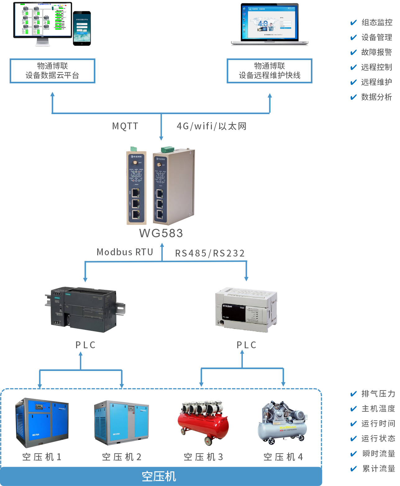 物通博聯(lián)推出的食品空壓機數(shù)據(jù)采集遠程監(jiān)控系統(tǒng)由工業(yè)智能網(wǎng)關(guān)WG583和物聯(lián)網(wǎng)平臺組成。工業(yè)智能網(wǎng)關(guān)WG583通過與空壓機PLC通信,實現(xiàn)實時數(shù)據(jù)采集和傳輸;云平臺與工業(yè)智能網(wǎng)關(guān)實時通信,實現(xiàn)主機溫度、排氣壓力、瞬時流量、累計流量等數(shù)據(jù)以及空壓機運行狀態(tài)、運行時間的可視化展示與組態(tài)監(jiān)控;移動端通過在云平臺查看調(diào)取數(shù)據(jù)并接收報警信息,就能及時采取措施管理控制與遠程維護,保證空壓機運行穩(wěn)定可靠,避免計劃外的停機損失。