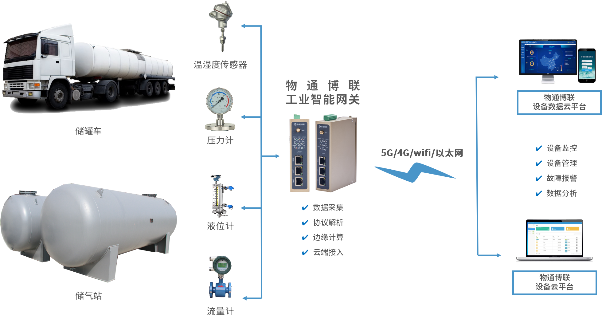 物通博聯(lián)工業(yè)網(wǎng)關(guān)采集溫度傳感器、壓力計、液位計、流量計等設(shè)備數(shù)據(jù)并以5G/4G/WIFI/以太網(wǎng)等方式上傳到設(shè)備遠(yuǎn)程運(yùn)維管理平臺。通過云平臺實現(xiàn)對液位、壓力、溫度、流量等數(shù)據(jù)的在線監(jiān)測,并實現(xiàn)設(shè)備運(yùn)行監(jiān)控、遠(yuǎn)程管理、故障報警等功能,進(jìn)而判斷燃?xì)廨斉湓O(shè)備的工作狀態(tài),保證燃?xì)廨斉湓O(shè)備的安全穩(wěn)定運(yùn)行,有力支持燃?xì)廨斉涞陌踩芾砉ぷ鳌?/p>