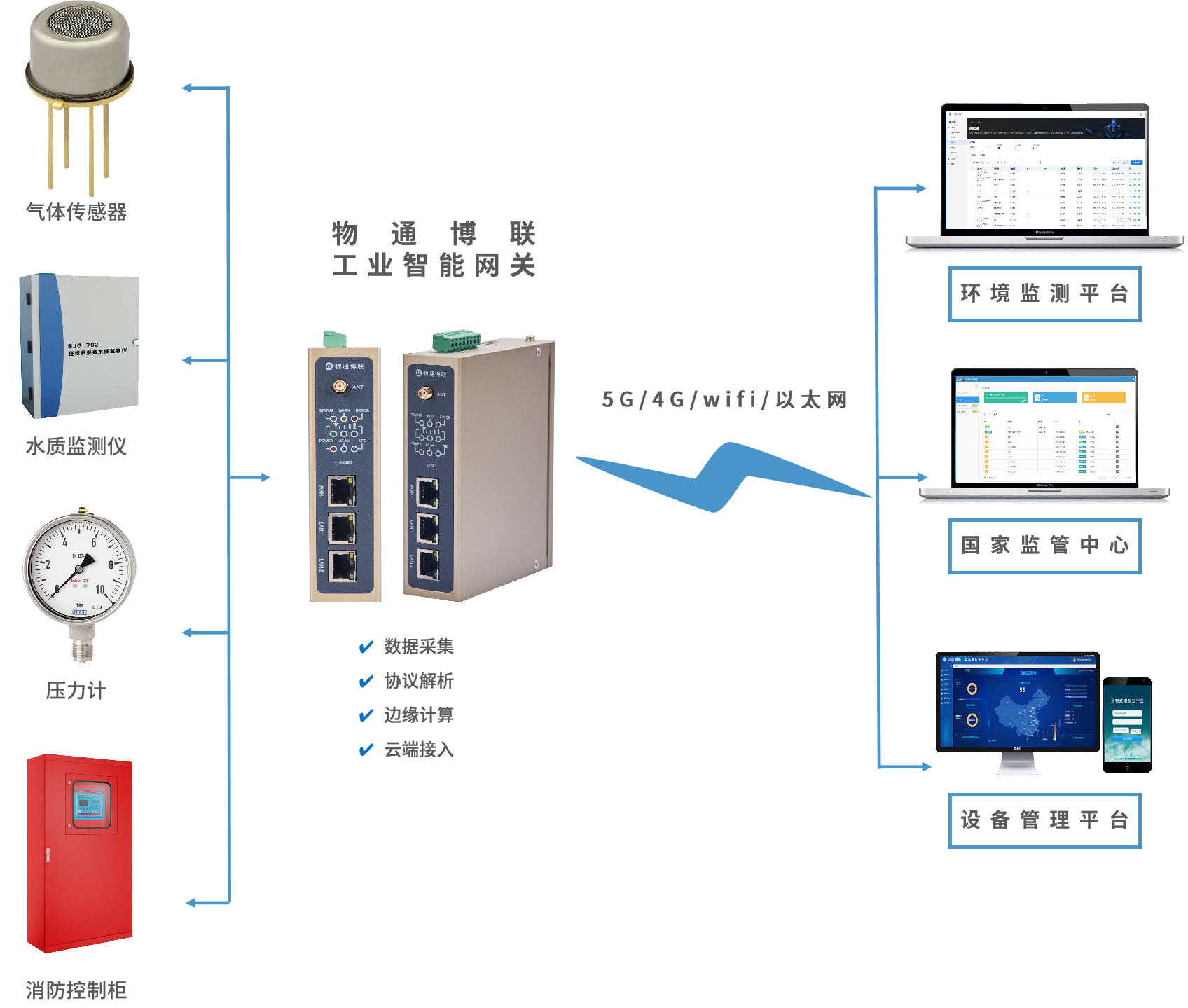物通博聯(lián)的推出環(huán)境監(jiān)測(cè)安全預(yù)警系統(tǒng),將工廠內(nèi)的危險(xiǎn)氣體傳感器、廢水監(jiān)測(cè)儀、管道壓力計(jì)及消防控制柜PLC接入到工業(yè)智能網(wǎng)關(guān)中,由工業(yè)智能網(wǎng)關(guān)采集各項(xiàng)環(huán)境參數(shù)和設(shè)備數(shù)據(jù)并上傳到上位機(jī)或云平臺(tái)進(jìn)行監(jiān)控和展示,進(jìn)而實(shí)現(xiàn)工廠現(xiàn)場(chǎng)和國(guó)家監(jiān)管中心的聯(lián)動(dòng)監(jiān)管和實(shí)時(shí)控制,保證現(xiàn)場(chǎng)環(huán)境安全穩(wěn)定和可控。