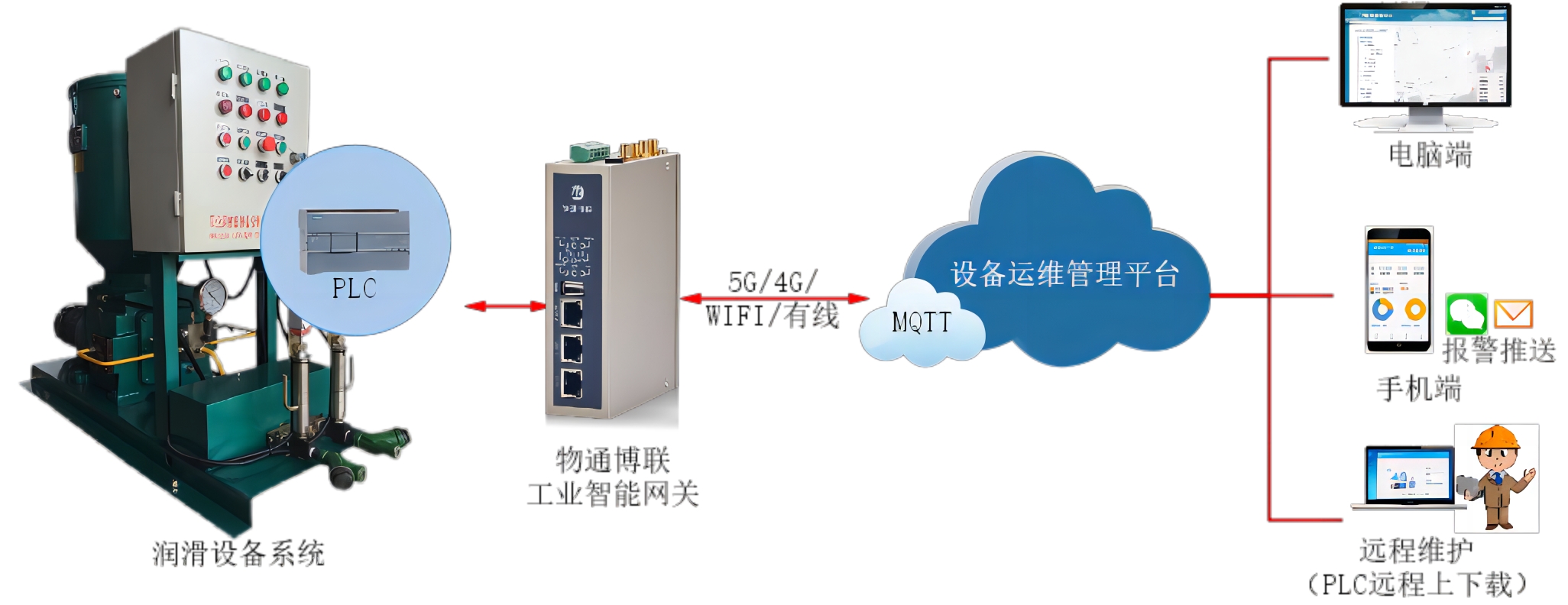 依托工業(yè)物聯(lián)網(wǎng)、大數(shù)據(jù)和云計算技術(shù),物通博聯(lián)提供“工業(yè)智能網(wǎng)關(guān)+數(shù)據(jù)云平臺”的解決方案。通過工業(yè)智能網(wǎng)關(guān)把分布在各個地區(qū)的潤滑設(shè)備連接起來,對潤滑設(shè)備PLC進(jìn)行數(shù)據(jù)采集并通過5G/4G/WIFI等方式上傳到云平臺,實現(xiàn)手機(jī)端/電腦端/云組態(tài)對設(shè)備和項目的監(jiān)控和管理。