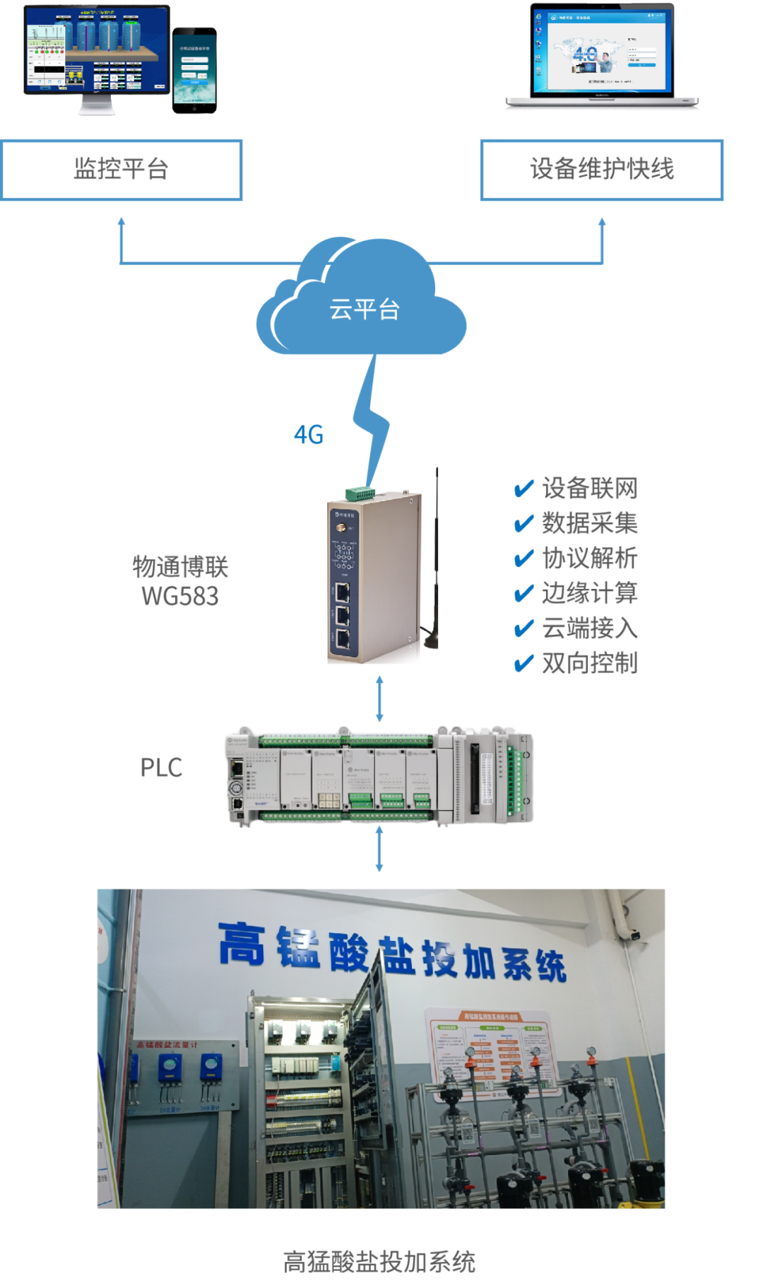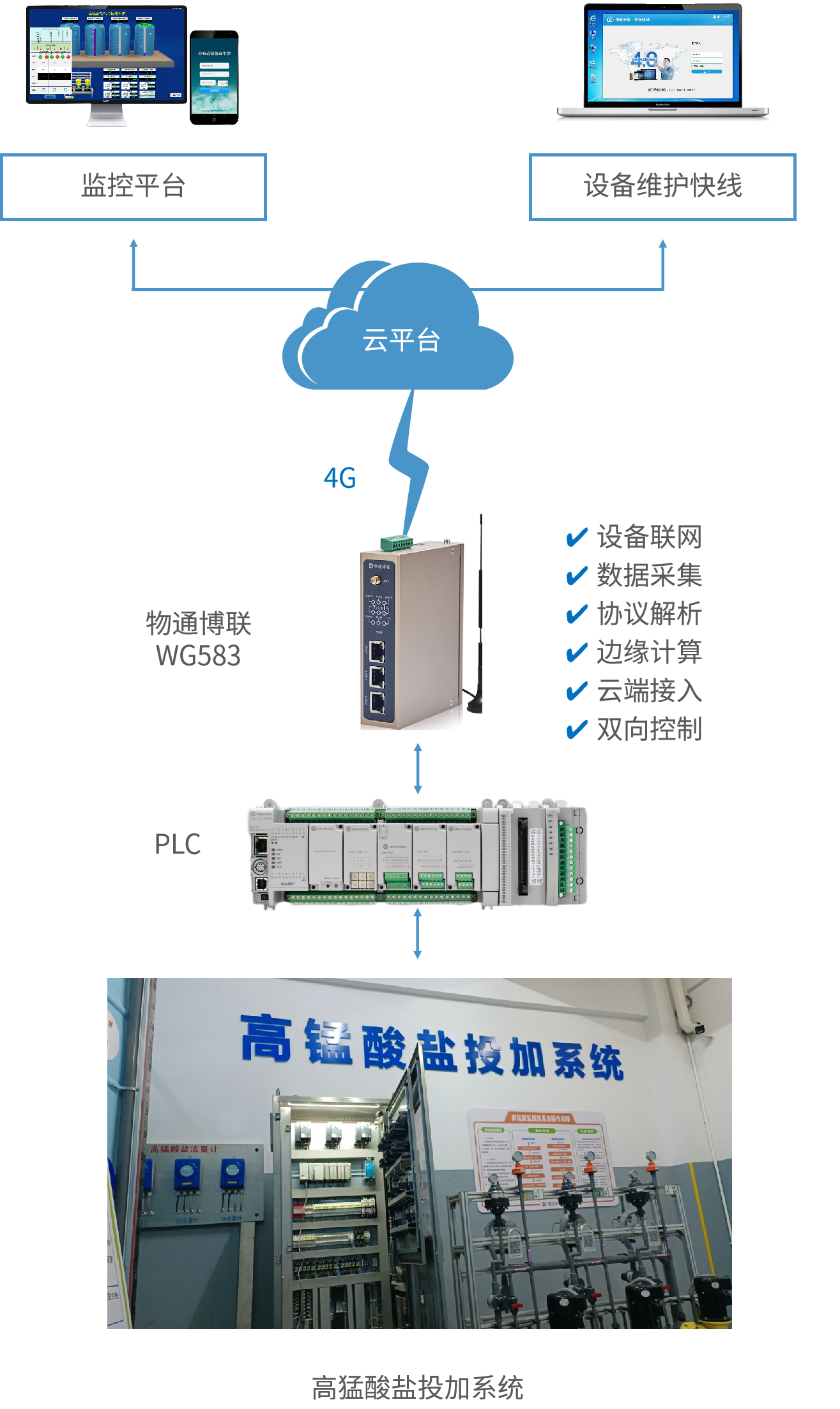 該自來水公司是一家致力于“供排水一體化、城鄉(xiāng)水務一體化、投資建設運營一體化”的水務一體化運營企業(yè)。本次項目使用物通博聯(lián)工業(yè)智能網(wǎng)關+IOT云平臺搭建高錳酸鹽投加設備物聯(lián)網(wǎng)系統(tǒng),旨在實現(xiàn)對自來水廠水務進行智慧管理,確保穩(wěn)定高效運行。