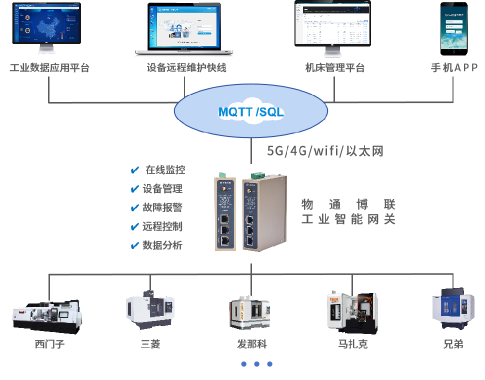 物通博聯(lián)推出的工業(yè)智能網(wǎng)關(guān)能夠接入西門子、三菱、馬扎克、發(fā)那科、海德漢、哈斯、兄弟、臺(tái)灣寶元、廣州數(shù)控等數(shù)控機(jī)床,實(shí)時(shí)采集設(shè)備數(shù)據(jù)、加工數(shù)據(jù)、刀具數(shù)據(jù)、生產(chǎn)數(shù)據(jù)等并對(duì)接到工廠MES系統(tǒng)、ERP系統(tǒng)中,從而實(shí)現(xiàn)手機(jī)端、電腦端、車間看板對(duì)各項(xiàng)數(shù)據(jù)的展示、告警、管理與分析,為生產(chǎn)、運(yùn)維、物料等相關(guān)工作開展提供全面準(zhǔn)確的數(shù)據(jù)支持,助力企業(yè)制定科學(xué)合理決策,促進(jìn)高質(zhì)量發(fā)展。