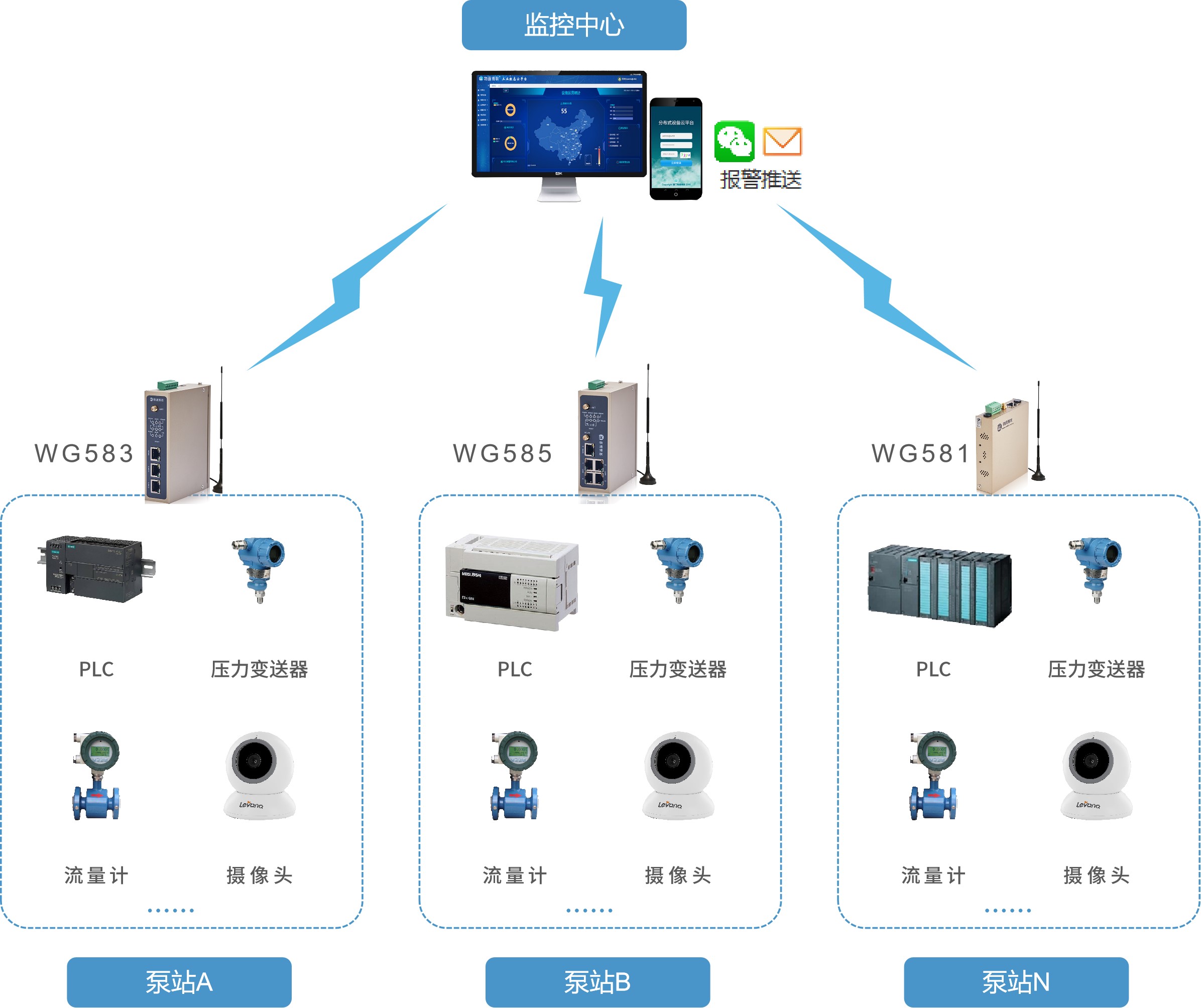 通過(guò)接入水泵控制柜PLC、壓力計(jì)、流量計(jì)、攝像頭等設(shè)備,物通博聯(lián)水利監(jiān)測(cè)網(wǎng)關(guān)能夠?qū)崟r(shí)采集水泵閥門的運(yùn)行狀態(tài)與工藝參數(shù)、管網(wǎng)水壓及流量、現(xiàn)場(chǎng)視頻等數(shù)據(jù),并通過(guò)5G/4G無(wú)線網(wǎng)絡(luò)上傳到泵站監(jiān)控管理平臺(tái)中,從而實(shí)現(xiàn)遠(yuǎn)程監(jiān)控、自動(dòng)告警、遠(yuǎn)程控制、運(yùn)維管理、遠(yuǎn)程維護(hù)多種功能,從而為泵站巡檢運(yùn)維與數(shù)據(jù)分析等工作提供全面可靠的數(shù)據(jù)支持,助力做出科學(xué)合理決策,有效加強(qiáng)泵站管理水平,保障取水安全。