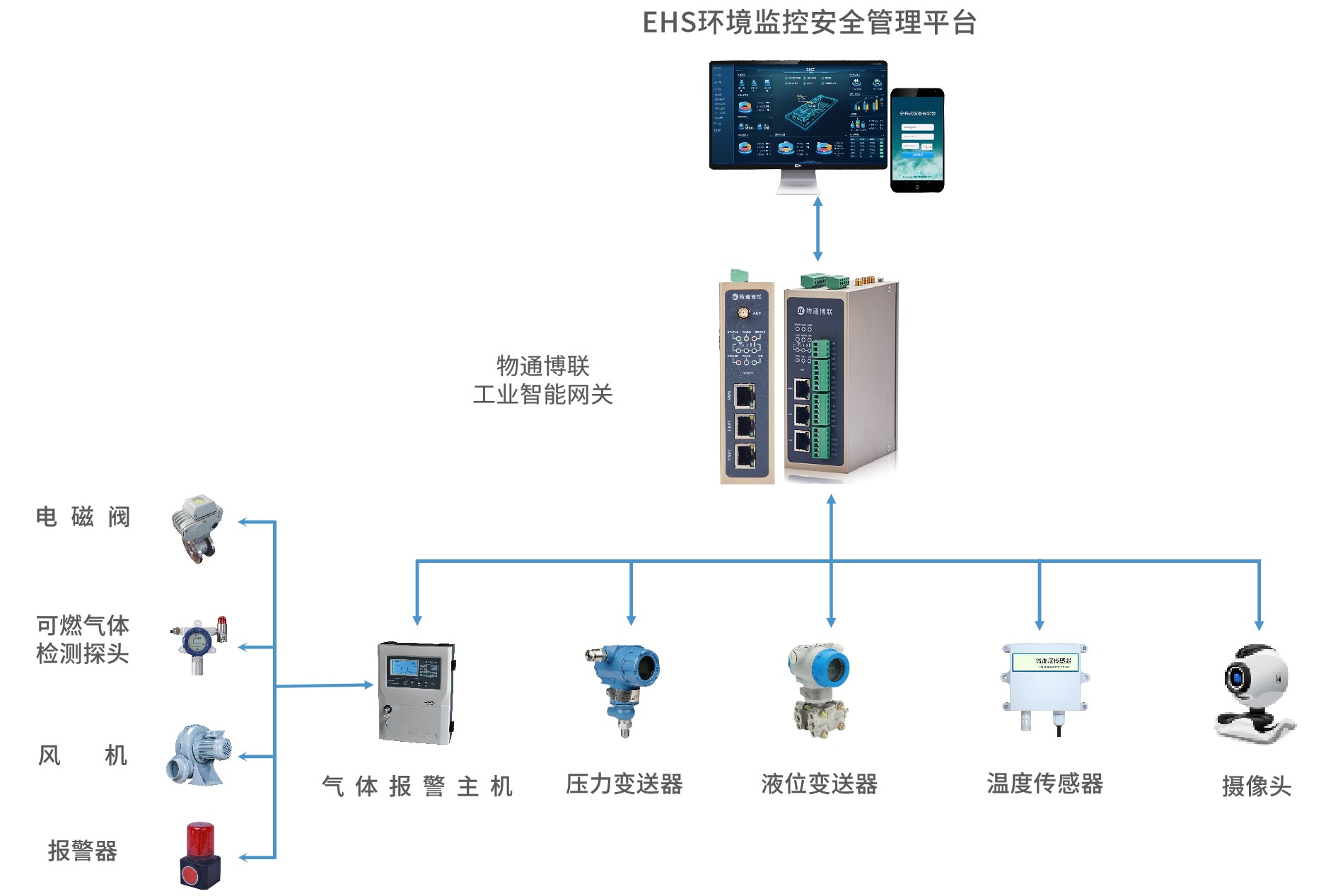 現(xiàn)場(chǎng)可燃?xì)怏w探測(cè)主機(jī)為RS485串口,通過(guò)接入物通博聯(lián)工業(yè)智能網(wǎng)關(guān),能夠?qū)崟r(shí)采集液位、壓力、溫度等數(shù)據(jù),并通過(guò)工廠局域網(wǎng)對(duì)接到EHS環(huán)境監(jiān)控安全管理平臺(tái)中,從而實(shí)現(xiàn)車間各點(diǎn)位環(huán)境參數(shù)的實(shí)時(shí)監(jiān)控、超限告警、在線管理等,及時(shí)采取措施管理控制,保證車間環(huán)境安全,避免出現(xiàn)意外事故與經(jīng)濟(jì)損失。